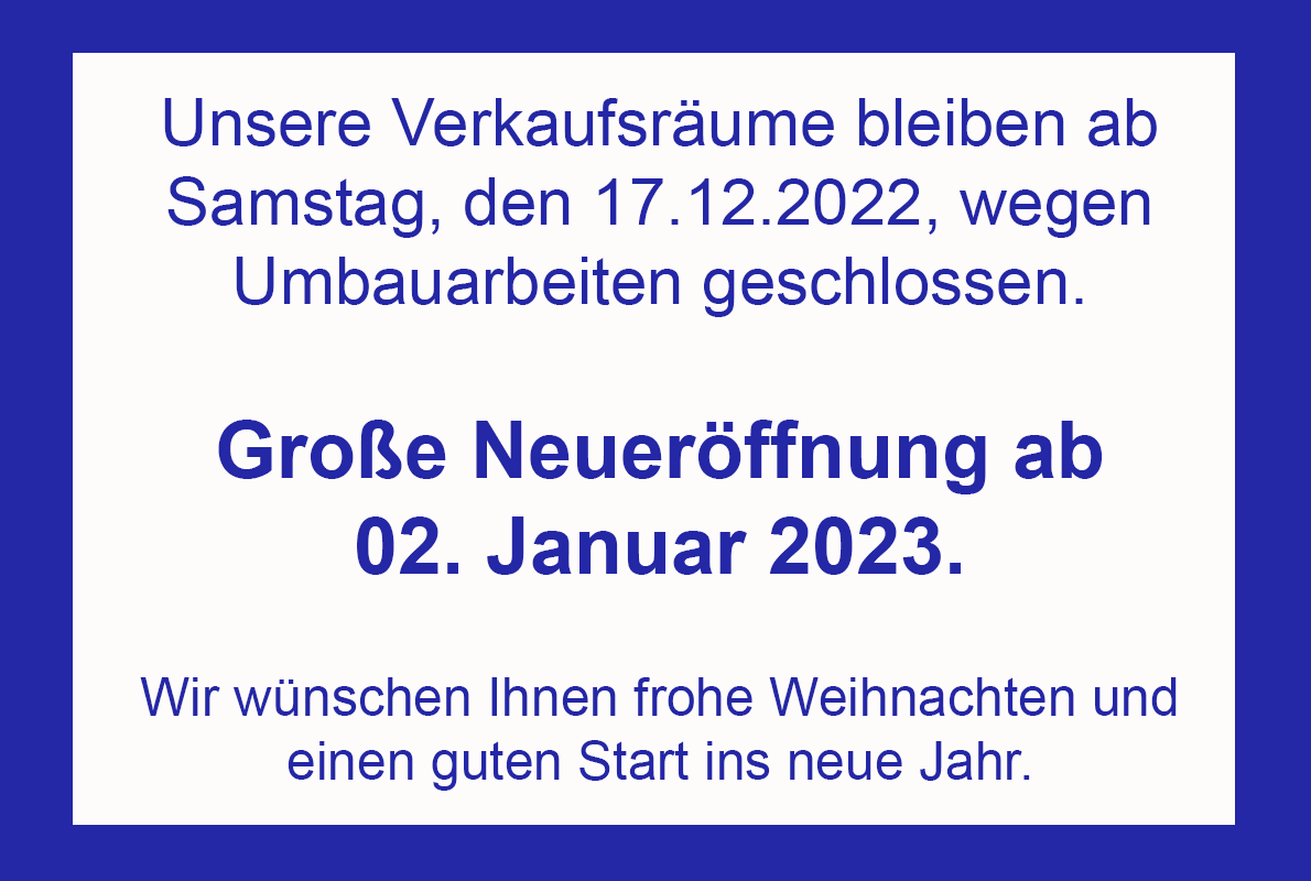 Öffnungszeiten Mo.-Fr. 9:00 bis 12:30 UhrMo.-Fr. 14:00 bis 18:30 Uhr Sa. 10:00 bis 15:00 Uhr